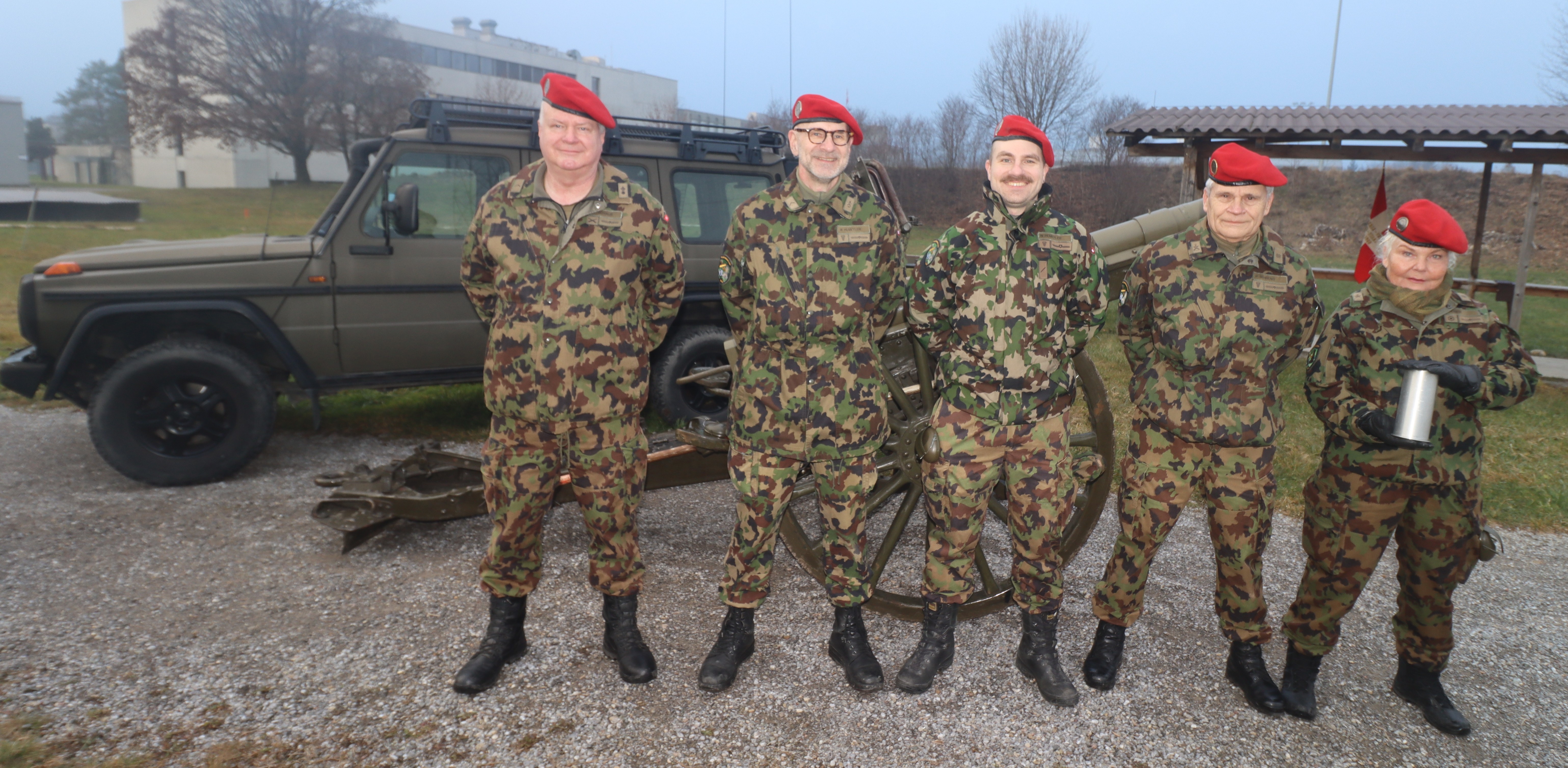 Die Kameraden Hauptfeldweibel Peter Behrens, Wachtmeister Iris Huber und Korporal David Schaub eingesammelt und in der Aussenstelle "Scherkessel" des Zeughaus Basel mit den Motfahrer unsere 7,5 cm Feldkanone aufgeladen. Gemeinsam machten wir uns mit zwei Fahrzeugen und der Kanone auf den Weg nach Bern. Bei der Raststätte Grauholz in Zwischenhalt eingeplant. Glücklicherweise sind wir frühzeitig in Spiez eingetroffen. damit genügend Zeit war den Ablauf des 3 Schuss Salut durchzuspielen.