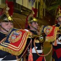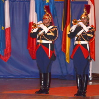 des Fanfare Gruppe der Garde Republicaine aus Paris begrüsst, deren musikalische